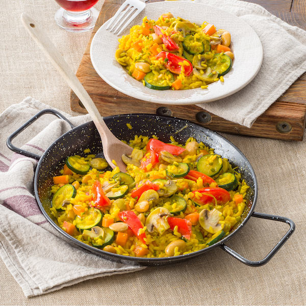 Tutto sommato di recente invenzione, nata per soddisfare le esigenze di chi segue un regime veg, esiste anche una paella... senza carne né pesce. Ma buona come le altre! Se volete sperimentarla, per 4 persone, pulite e tagliate 200 g di funghi champignon a fettine, 200 g di zucchine a rondelle, 170 g di pomodori perini a spicchi, 150 g di carote a tocchetti e un porro a listarelle molto sottili. Dorate il porro nella paellera con 4 cucchiai d’olio e uno spicchio d’aglio, sbucciato e tritato. Aggiungete le carote, lasciate insaporire, unite le zucchine, i funghi e circa 700 ml di brodo vegetale caldo. Al bollore, versate 300 g di riso e un cucchiaio di paprica. Cuocete 10 minuti, smuovendo ogni tanto il tegame. Unite 2/3 dei pomodori e una bustina di zafferano, sciolto in poco altro brodo. Regolate di sale e proseguite la cottura per altri 8 minuti. Saltate in una padella i pomodori tenuti da parte e salateli. Spegnete il fuoco sotto la paella e completatela con i pomodori spadellati. Cospargetela con una manciatina di granella di pistacchi tostati e spruzzate a piacere di limone o lime.