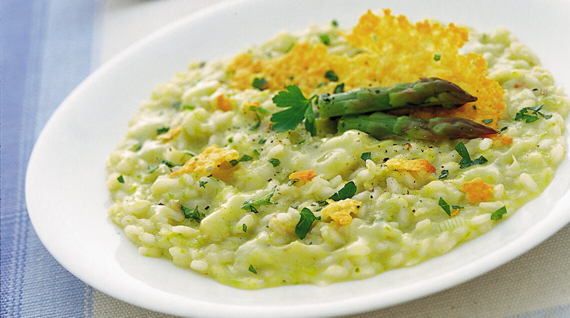 Il risotto agli asparagi con scaglie di grana è un piatto semplice e adatto a tutti i gusti, dotato di una gustosa cremosità ma reso croccante dalle cialde di formaggio cotte al forno