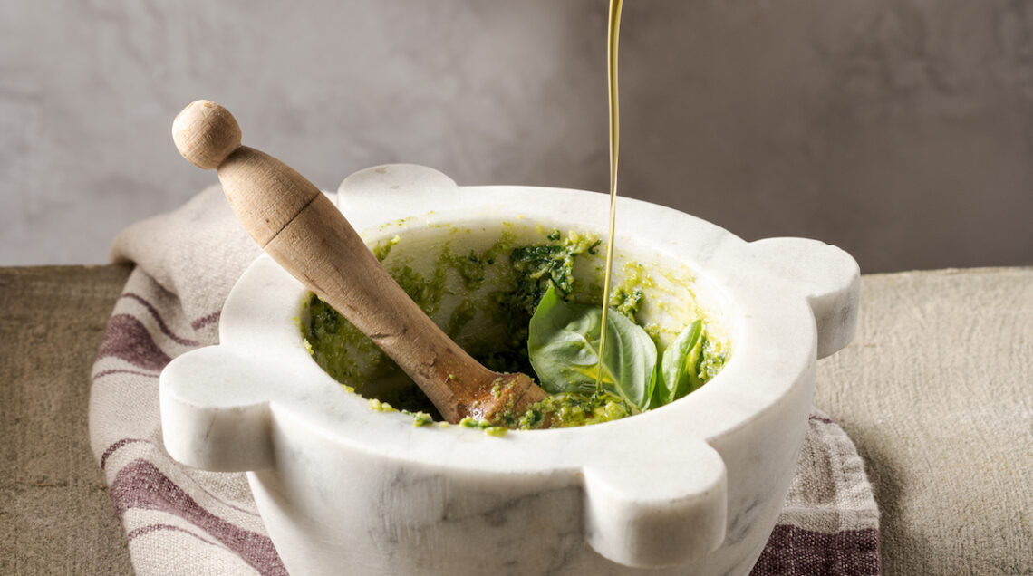 Quella del pesto alla genovese è, a ben guardare, una tradizione piuttosto recente. La prima traccia scritta compare infatti solo attorno al 1860, nel ricettario “La Cuciniera Genovese” di Gio Batta e Giovanni Ratto, padre e figlio. Se per l’origine del nome ci sono dubbi, essendo tipicamente preparato con mortaio e pestello, quella della ricetta si perde nel tempo. C’è chi la collega a preparazioni analoghe a base di fave o alla salsa di noci e chi, addirittura, si richiama al moretum degli antichi Romani, sorta di crema di formaggio ed erbe.