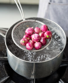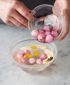 Portate a bollore 170 ml d'acqua con il vino, l'aceto e 80 g di zucchero e fate raffreddare. Scottate i ravanelli per 3-4 minuti in acqua salata, scolateli e fateli raffreddare.