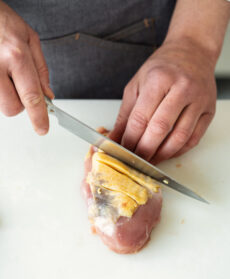 Si incide la polpa del volatile lungo la spina dorsale da entrambi i lati e si estraggono le due parti di petto. Il petto intero si cuoce con la pelle in modo che la carne resti tenera e non si asciughi troppo con il calore. Il petto tagliato a fettine sottili dà le "supreme”, dalla cottura rapidissima.