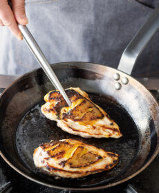Asciugate petti e filetti con carta da cucina. Fate dorare i petti per 8 minuti a fuoco basso in una padella antiaderente, o unta con 1 cucchiaio di olio, prima dalla parte della pelle e voltandoli a metà cottura. Negli ultimi 3-4 minuti unite i filetti. Togliete la carne dalla padella e avvolgetela in alluminio.