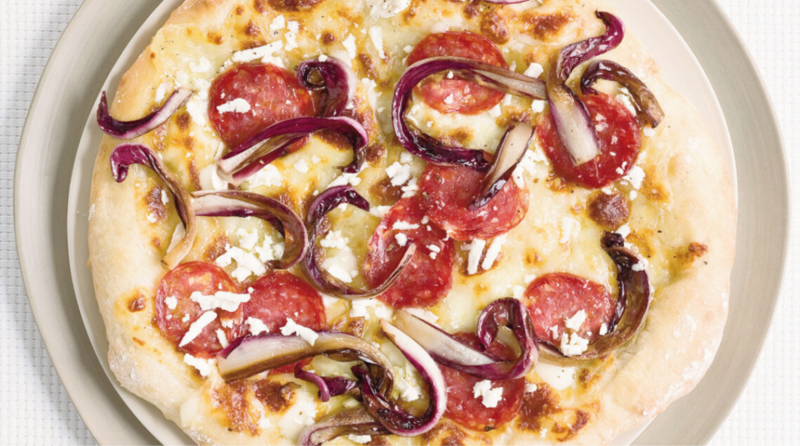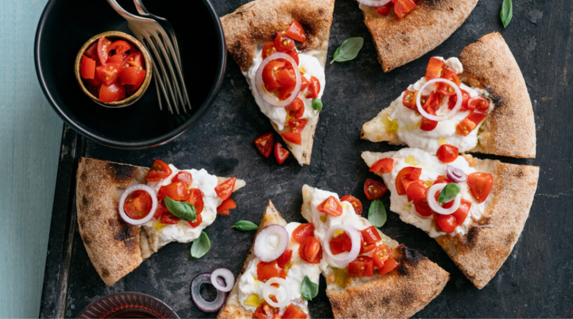 Una pizza di semplice preparazione realizzata con mozzarella, burrata e pomodorini e arricchita dalle cipolle di Tropea.