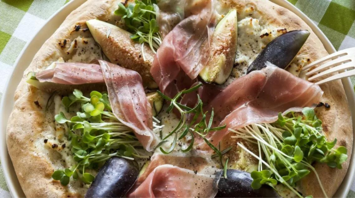 Pizza bianca con ricotta al pepe, prosciutto crudo e fichi
