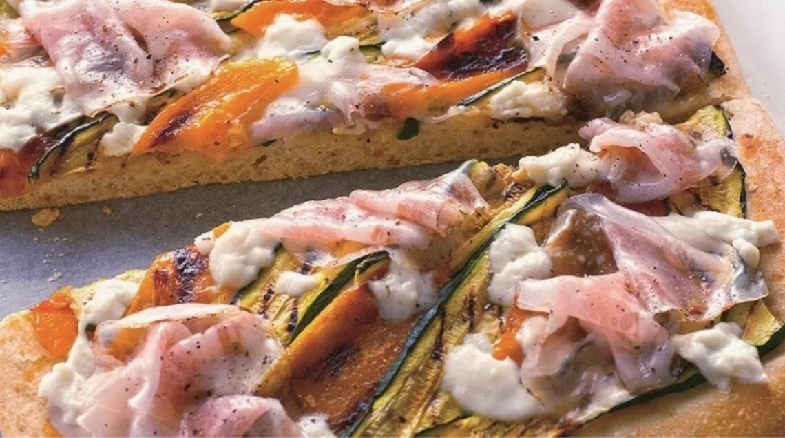 Una pizza speciale, fragrante e dorata grazie a un po' di miele nell'impasto. L'incontro tra le verdure, la burrata e il guanciale regala un gusto a tuttotondo. Una vera squisitezza, da gustare anche fredda.