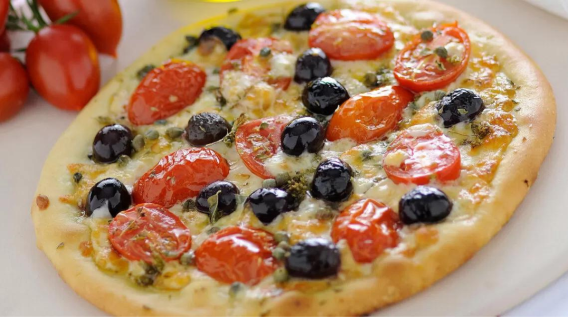 Catalogna, olive liguri e scaglie di primosale sono il gustoso condimento di questa pizza dai sapori decisi
