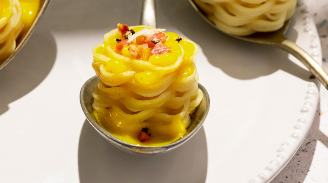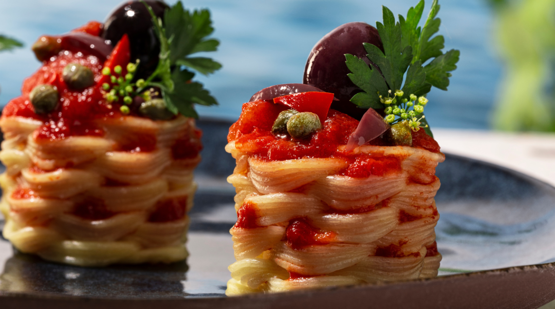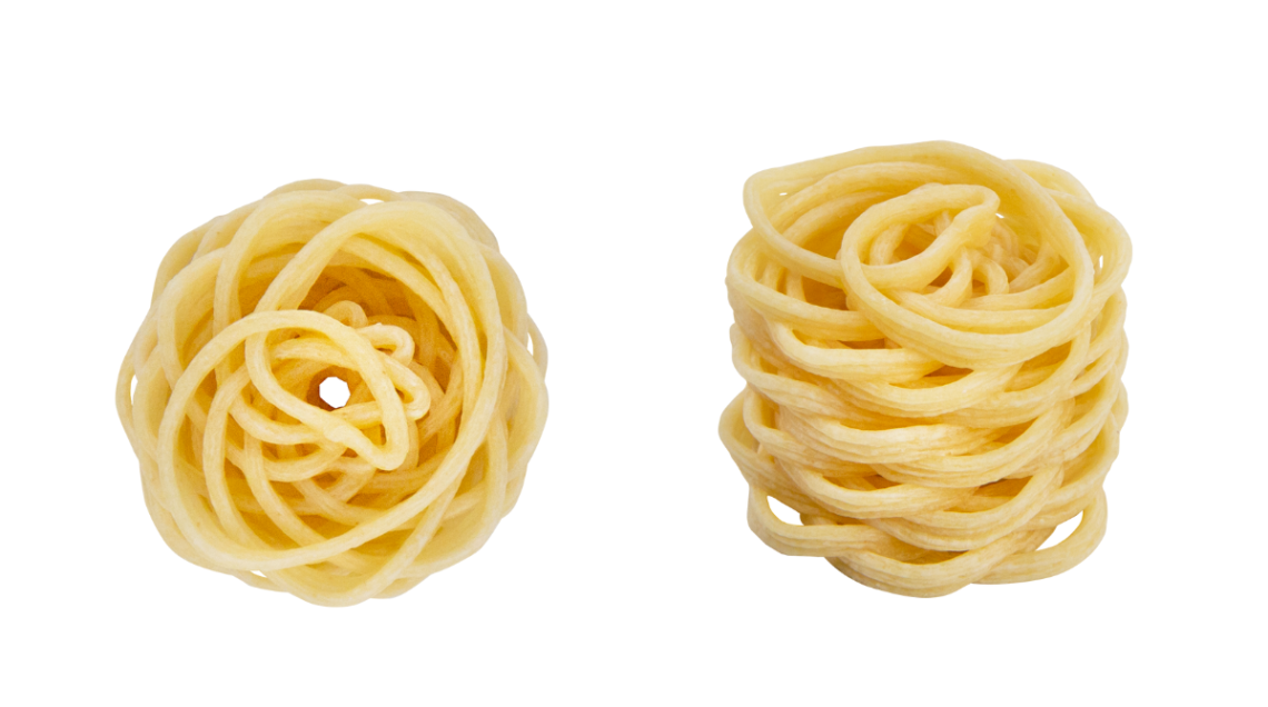 E “lui” com’è? È un piccolo nido (le sue misure sono extrasmall: 3 cm di base per 2,3 di altezza) di pasta secca, fatto di spaghetti arrotolati che vanno a creare una matassa pronta ad essere impreziosito da sughi, creme, gelatine, spume. Dopo la cottura (7 minuti come per qualsiasi spaghetto della tradizione) è pronto per ricevere i condimenti che non solo possono avvolgere il piccolo nido ma sono accolti nel centro, tra gli intrecci della pasta, tra gli interstizi creati dalla stampante. E quando lo si porta alla bocca l’esperienza, unica, è quella di percepire profumi, consistenze, gusti che cambiano in ogni momento della masticazione. La pasta diventa uno scrigno croccante per un semplicissimo sugo di pomodoro arricchito da spuma di basilico, oppure viene ripassata in padella per renderla ancora più crunchy o, ancora, diventa un originale dessert (se cottain acqua zuccherata) con crema pasticcera, gel di bergamotto e spuma di cocco.