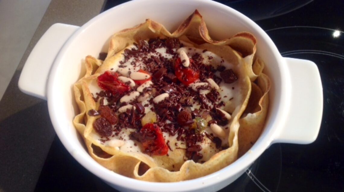 In una teglia rettangolare o, meglio, in piccole cocotte individuali montare le millefoglie partendo da una piccola cucchiaiata di besciamella, la crepes, le verdure, la besciamella e continuare fino al termine degli ingredienti. Sulla superficie distribuire l’ultima parte di besciamella, decorare con qualche tocchetto di caponatina ed i datterini confit e cucinare nel forno statico già caldo a 180° per 20’. Sfornare e servire decorando con il cioccolato fondente al sale di Cervia.