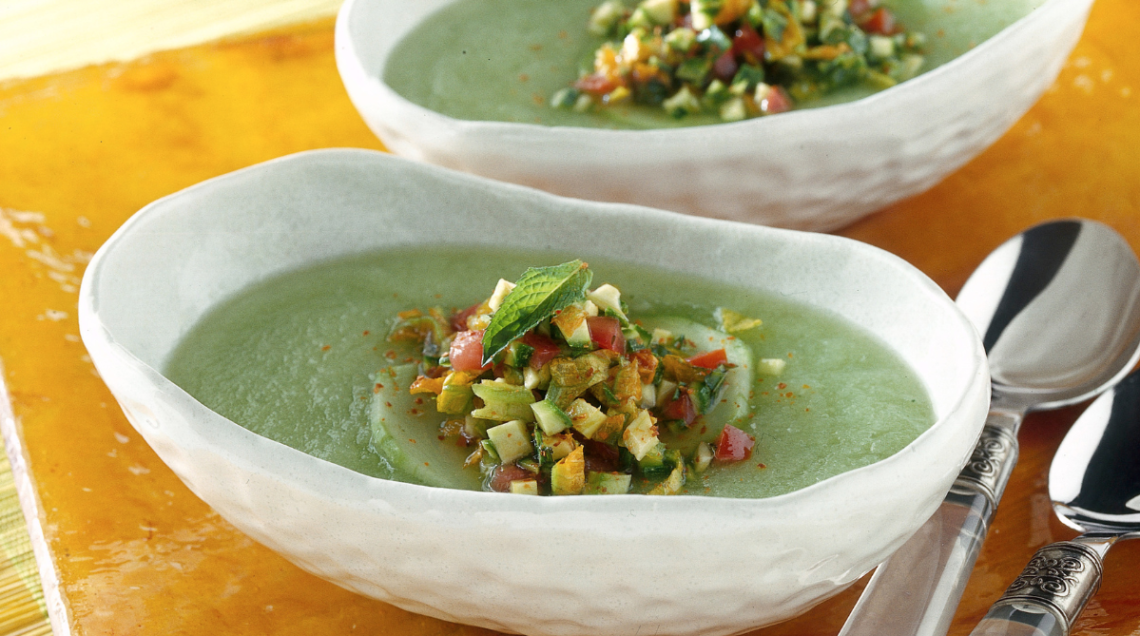 Una vellutata fredda leggera e sfiziosa al profumo di menta: perfetta per fare il pieno di nutrienti preziosi senza appesantire digestione e linea