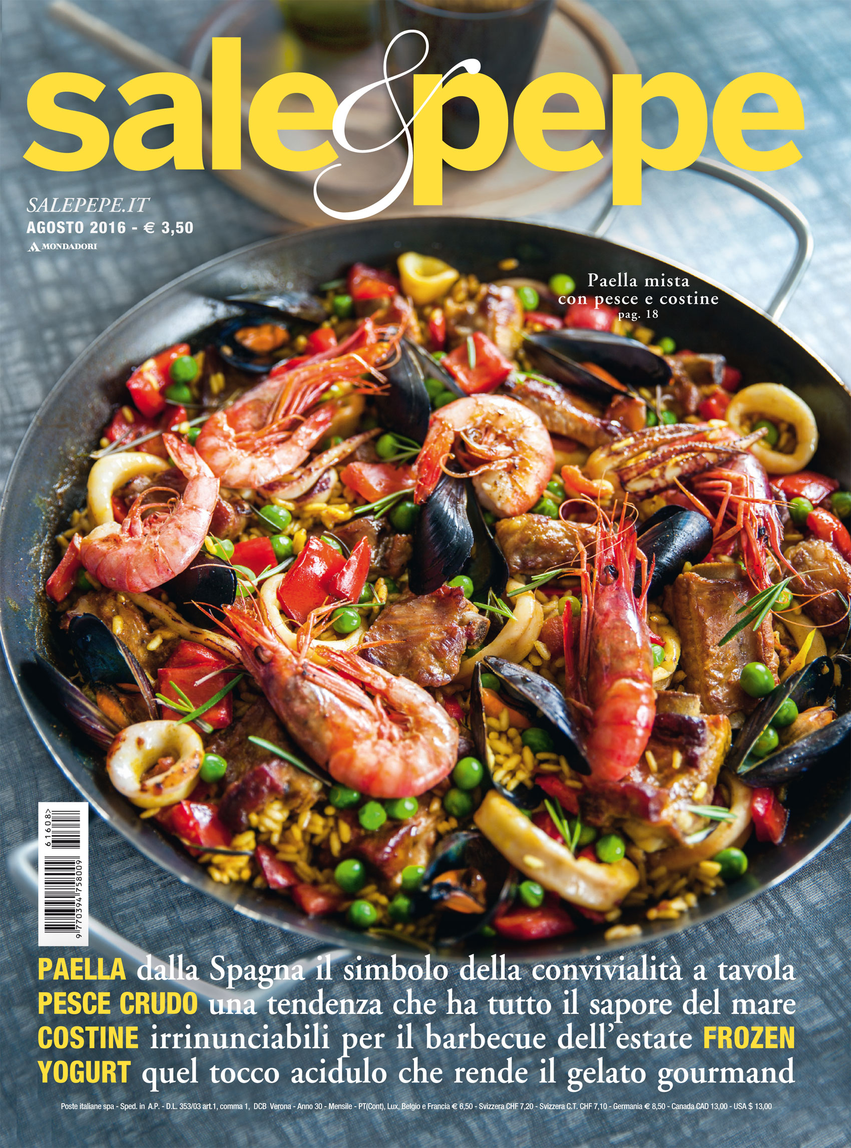 Dal 20 luglio 2016 è in edicola la nuova edizione di Sale&Pepe con tante idee per ricchi piatti di paella da gustare con gli amici, costine irrinunciabili per il barbecue dell'estate, frozen yogurt per un gelato gourmand