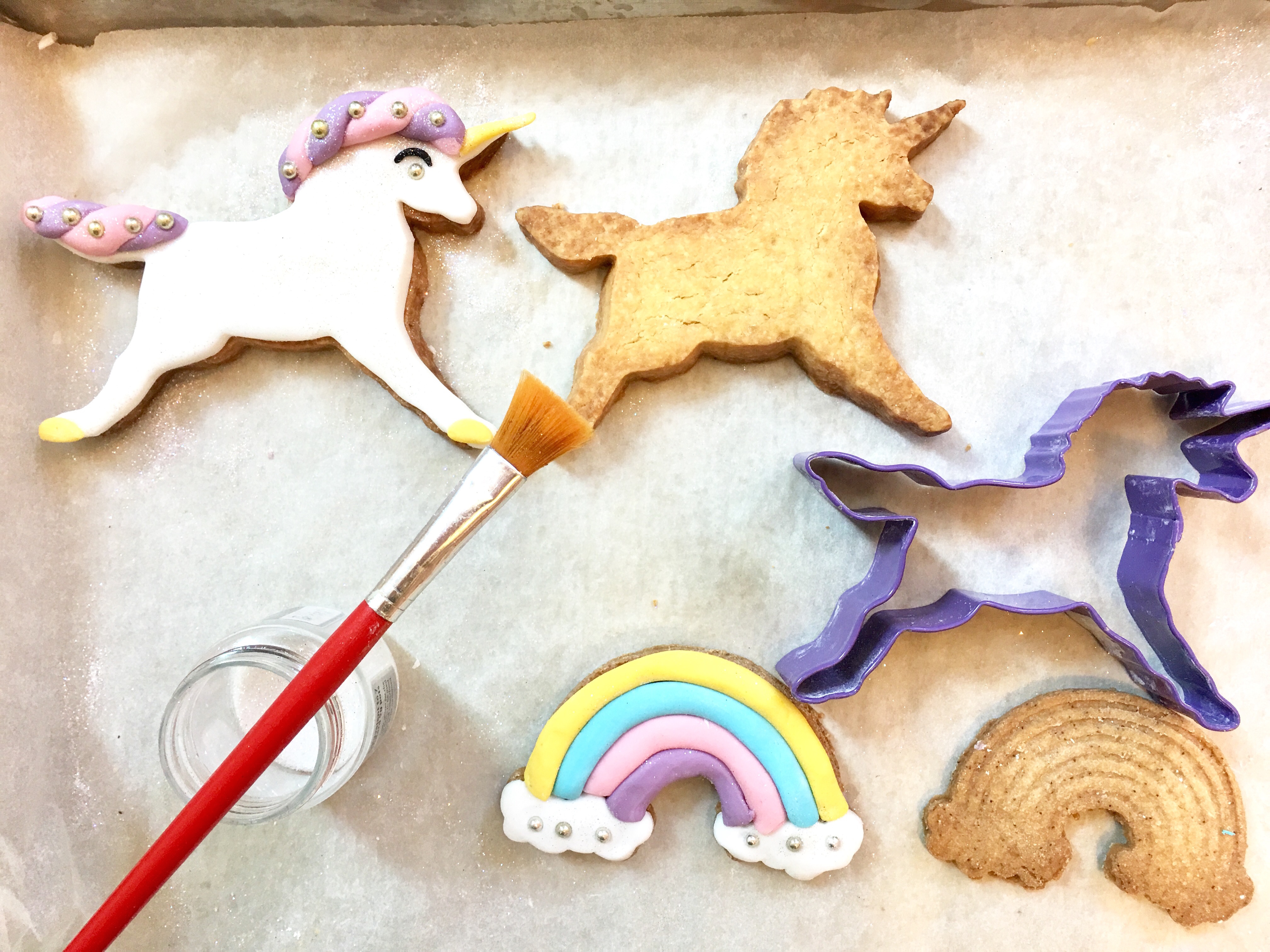 Completare con decori realizzati tagliando la pasta da zucchero colorata e modellata con un tagliabiscotti a forma di unicorno.
