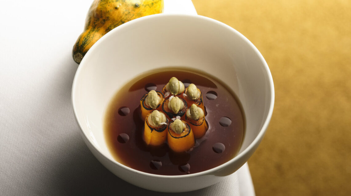 Continua poi Eugenio Boer, che grazie all'affiancamento dello chef Norbert Niederrkofler, paladino del “no-waste”, presso il St.Habertus, scopre la cucina di montagna, apprezzandone l'attaccamento al territorio "non facile", oltre che il concetto di famiglia. Dopo l'apertura del ristorante di Milano, nel giugno 2018, [bu:r], Boer, durante la pandemia inizia a concentrarsi esclusivamente sul “Made in Italy”, proponendo piatti realizzati interamente con prodotti nostrani, abbracciando esclusivamente sapori tipici. Di pari passo a questo concetto viene introdotto anche quello della sostenibilità, che si traduce nell’utilizzo delle materie prime in tutte le loro parti. Una tematica molto cara allo Chef, sensibile all’importanza che riveste il rispetto per l’ambiente, a maggior ragione in questo particolare momento storico. Quello che ne consegue è una carta che limita i consumi e sposa la filosofia dello zero waste. È così che nasce la zucca, l’amuse bouche autunnale di [bu:r] (in foto) proposta in un solo elemento composto da ogni singola sua parte: rotolini di zucca in criocottura, consommè di bucce di zucca, olio di semi di zucca e semi di zucca tostati. Un altro piatto che riunisce in sé sostenibilità e innovazione è Ciapinabò & Castagne, realizzato con due soli ingredienti, la castagna e il topinambur. Poi la Crema fredda di verdure al basilico e crostini di pane, per l'iniziativa Too Good to go.