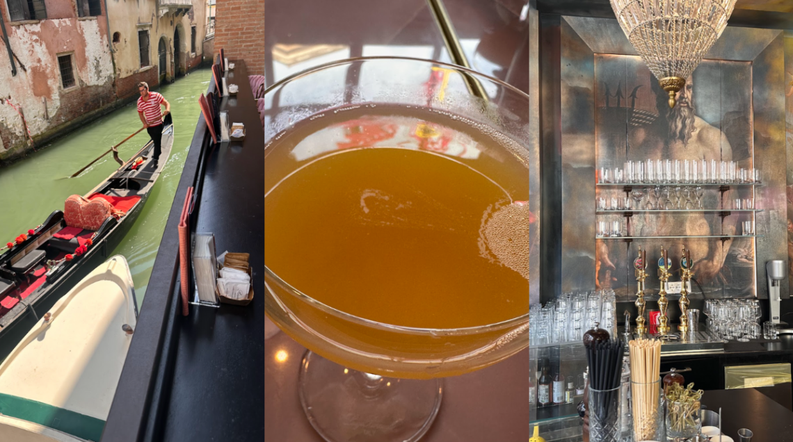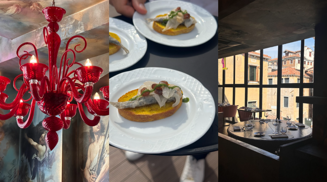 Al piano terra, l’atmosfera è dinamica e informale: cicchetti veneziani, caffetteria, piatti veloci e da asporto pensati per chi vive o attraversa la città, con la possibilità di fermarsi su una balconata che si affaccia direttamente sul canale. Al tramonto, questo spazio diventa quasi magico: sorseggiare un cocktail guardando passare le gondole regala una prospettiva intima e autentica della laguna. Salendo al piano nobile, lo scenario si apre: un ambiente luminoso, arricchito da lampadari di Murano e dettagli d’arredo che mescolano richiami rinascimentali a suggestioni contemporanee.