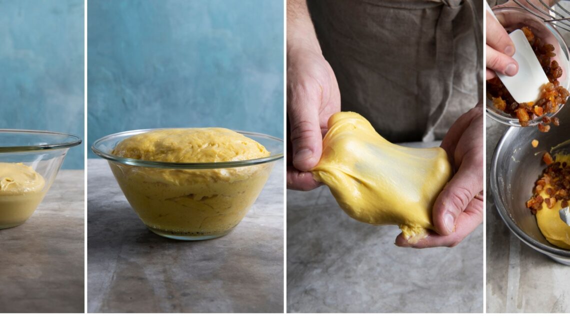 375 g di farina 00 W370-390 (farina Petra 6384) – 175 g di burro – 195 g di tuorlo – 120 g di zucchero – 50 g di lievito madre – 150 g di scorze di arancia candite a cubetti – 115 g di uvetta – 1 baccello di vaniglia – 6 g di sale