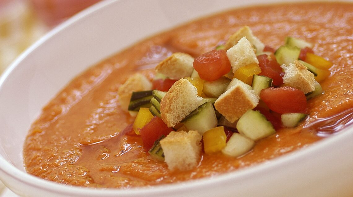 Gazpacho andaluso Il gazpacho, popolare zuppa fredda di ortaggi a crudo, tritati o frullati (solitamente pomodori, cetrioli, cipolle e peperoni). Le sue origini sono contadine, infatti in antichità veniva comodamente portato nei campi dentro a otri e gustato sul posto dai lavoratori che ne traevano benefici in quanto pasto semiliquido, rinfrescante e gustoso.
