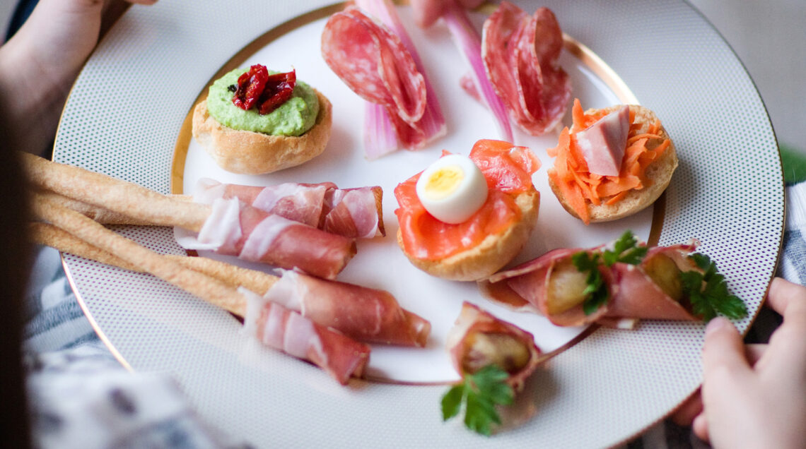 Grissini e friselle si fanno ricchi di salumi e pesce, verdura e frutta sciroppata per offrire un antipasto colorato e sfizioso