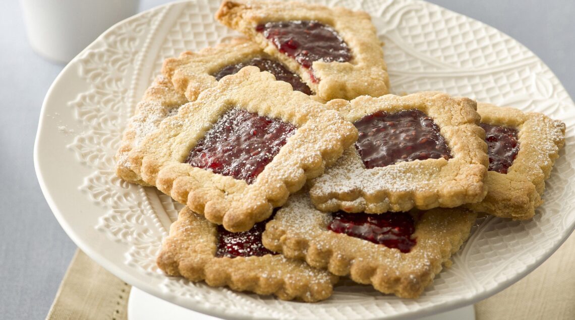 Qui il panorama è davvero ampio, si va dagli amaretti, classici e no, ai ricciarelli di Siena, alla pasta reale. Diffusa maggiormente al Sud – in Sicilia, in Puglia e nel Salento – perché di tradizione araba, la pasta reale o pasta di mandorle (i pizzicotti, i pasticcini ricci, le paste secche siciliane guarnite con canditi rossi o verdi oppure con una mandorla intera etc.) compare ufficialmente intorno all’anno 1100 nei conventi del Meridione. Biscotti che fanno capo a questa tipologia sono anche gli almendrados spagnoli, la figolla maltese, i Linzer (foto sotto), gli amygdalota greci, i kipferl e vanillekipferl austriaci. Da provare i biscotti in pasta di mandorle , i biscotti alle mandorle con cioccolato e i biscottini con ciliegie e marzapane.