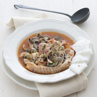 In Toscana si sfiora la leggenda con il famoso cacciucco alla livornese, preparato secondo la tradizione con 13 tipi di pesce, oggi ridotti a 5, quante sono le “C” del nome: 2 tipi di pesce da taglio, 2 tipi di pesce con lisca e 1 tipo di mollusco. Le proporzioni sono precise. Si serve con un sugo al pomodoro e salvia, e naturalmente pane aromatizzato all’aglio.