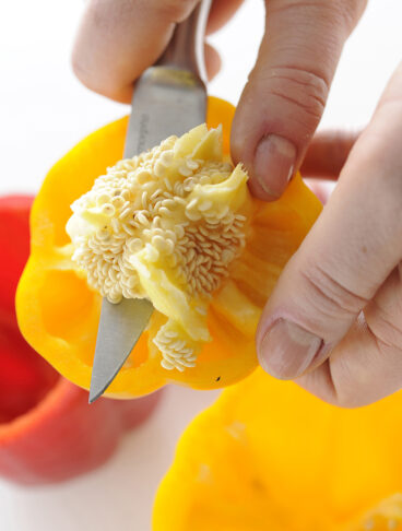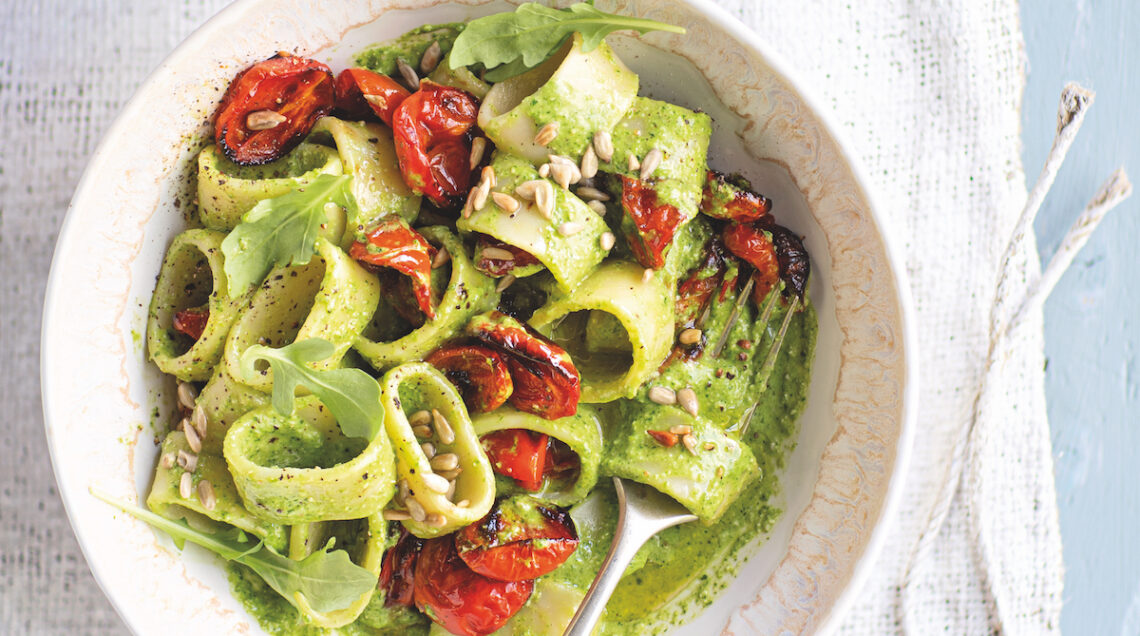 I mezzi paccheri conditi con un pesto leggero e profumato e verdure al forno, hanno il gusto croccante dei pinoli tostati