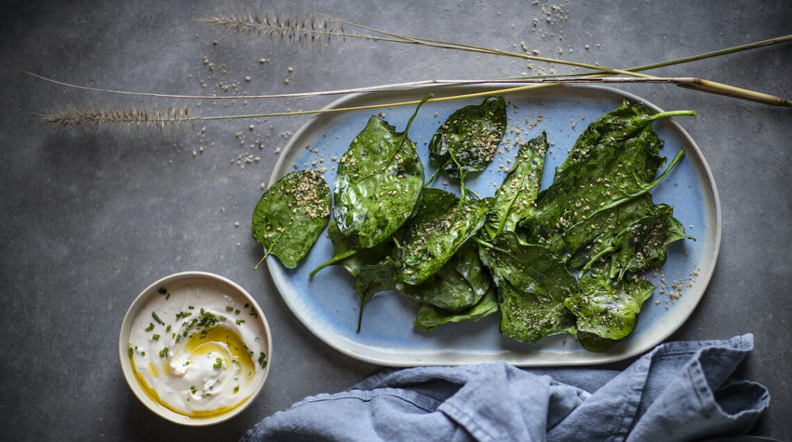 Chips di spinaci con salsa all’erba cipollina e sesamo
