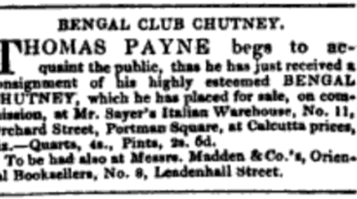 È il chutney o chatni, una conserva agrodolce che tipicamente accompagna i pasti indiani: il nome viene dall’hindi per “molto speziato”. Reso famoso dal Bengal Club a Calcutta, in India, il chutney è arrivato in Inghilterra nel XVII secolo grazie alle attività commerciali della Compagnia delle Indie Orientali, che portò in patria salse asiatiche di soia e pesce - tra cui il kecap indonesiano - e frutta e verdura sottaceto, il tutto conservato con spezie dai sapori intensi: i chatni, appunto, che conquistarono i palati degli inglesi (foto sotto, pubblicità per il Bengal Club Chutney da The Indian Mail di Londra, 1844) e poi, piano piano, il resto dell’Europa e del mondo. Le ricette classiche utilizzano frutta esotica, come mango e ananas, ma oggi sono molto diffusi – e molto buoni - anche chutney di frutta europea. Sebbene originari dell'India, i chutney hanno viaggiato anche nelle altre Colonie e oggi molti Paesi hanno la propria versione: per esempio, mentre i chutney britannici prediligono l'uso delle mele, quelli del Sud Africa includono spesso albicocche.