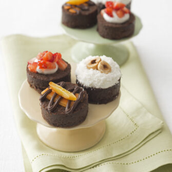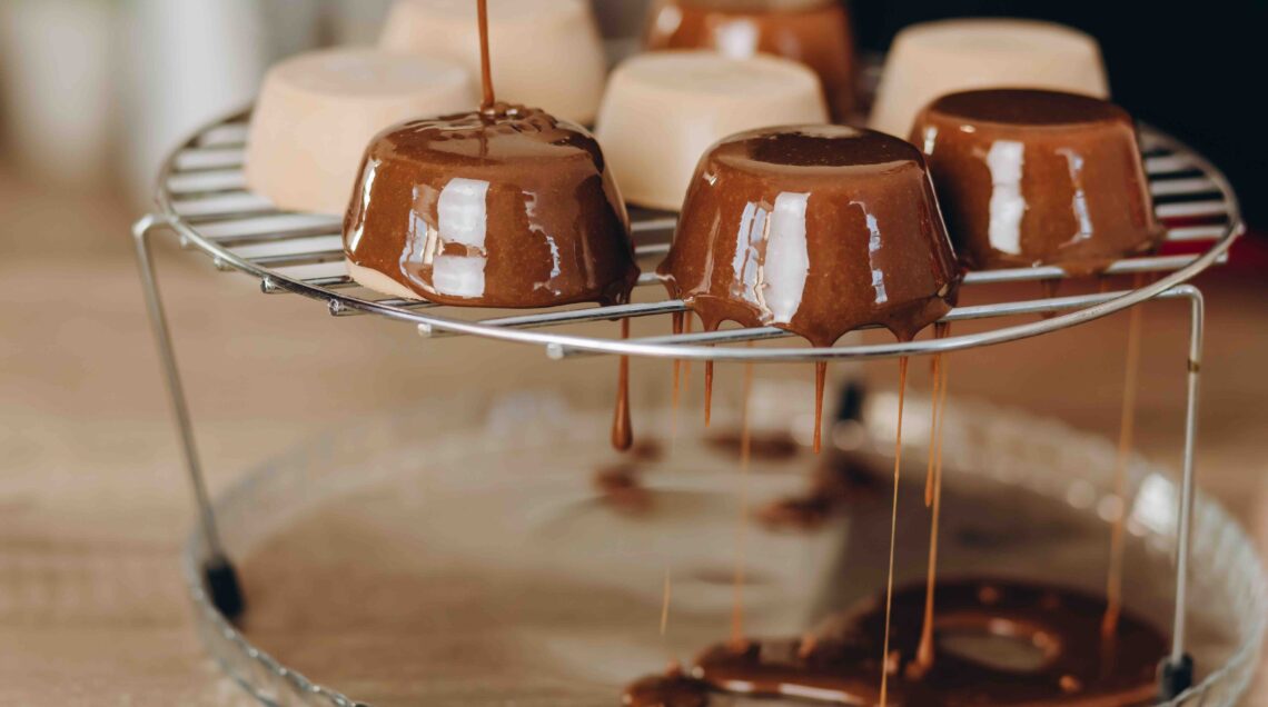 Per le glasse (foto sopra), scegliete cioccolato che contenga una percentuale più elevata di burro di cacao (più del 30% di burro di cacao), che lo rende più fluido e quindi più adatto a determinate applicazioni quali il rivestimento (foto sotto). Eventuali aromi (vaniglia, etc.) vanno aggiunti dopo aver fuso il cioccolato.