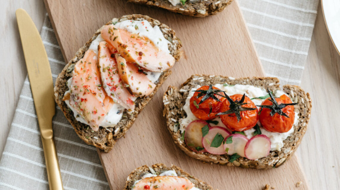 • Spalmate di burro salato 8 fette di pane integrale ai semi e guarnitene 4 con la burrata, i pomodorini, i ravanelli e dragoncello, le altre 4 con la crema di yogurt alle olive, il salmone a pezzetti, origano, olio e pepe rosa.