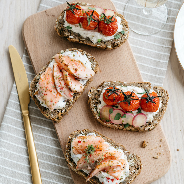 Smørrebrød alla mediterranea. Disponete 300 g di pomodorini su una teglia ricoperta di carta da forno. Insaporite con pepe, un filo di miele, uno d’olio, i semini di un baccello di vaniglia e foglioline di dragoncello. Infornate a 120° per un’ora. Saltate in padella 3-4 ravanelli a fettine sottili con olio e sale. A parte, scottate un trancio di salmone di circa 400 g in una padella con olio, sale, pepe e origano fresco. Mescolate 300 g burrata con un cucchiaino raso di fiori di sambuco o di camomilla. In una terrina, mescolate 300 g di yogurt greco con una grattugiata di zenzero, 4 cucchiai di olive taggiasche denocciolate e spezzettate e una macinata di pepe. Spalmate di burro salato 8 fette di pane integrale ai semi e guarnitene 4 con la burrata, i pomodorini, i ravanelli e dragoncello, le altre 4 con la crema di yogurt alle olive, il salmone a pezzetti, origano, olio e pepe rosa. Per 4 persone.