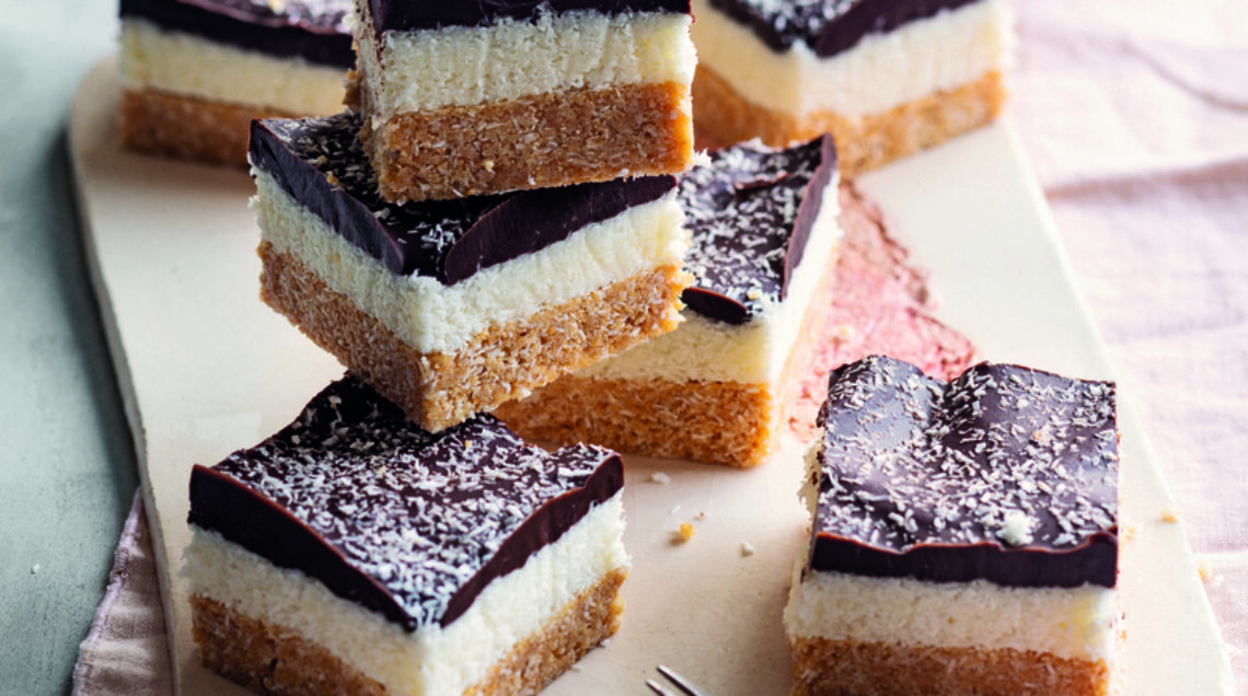 1) Per la base: rivestite con un foglio di carta da forno una teglia quadrata da 20x20 cm. Frullate i biscotti fino a ridurli in polvere. Sciogliete il burro in un pentolino a fuoco dolce. In una ciotola amalgamate i biscotti tritati, il burro fuso, e il cocco rapè. Trasferite il composto nello stampo, livellatelo con il dorso di un cucchiaio e trasferitelo in frigo per 5 minuti.