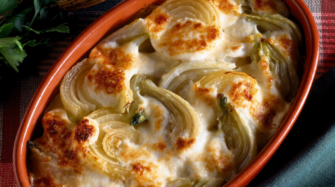 Rosolati nel burro assieme alle cipolle, i sottili spicchi di finocchi sono ricoperti di besciamella e passati al gratin. Un contorno delicato e gustoso