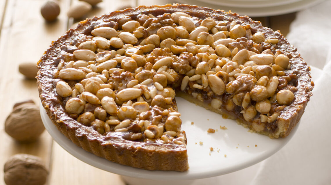 La pasta frolla fatta in casa accoglie un ricco ripieno preparato con frutta secca, amaretti e panna. Il dolce pensato per la fine di un pranzo informale è goloso anche a colazione e merenda
