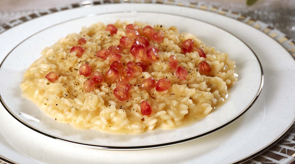 Anche il riso, come le lenticchie, porta abbondanza: stesso simbolismo, molti chicchi, molta ricchezza. Più chicchi si mangiano a Capodanno più fortuna arriverà nell'anno nuovo. Un risotto con la melagrana vale il doppio (foto sopra) come portatore di fortuna. In Abruzzo, a cena, non debbono mancare 7 minestre di 7 legumi diversi, portatrici di ricchezza. Brindisi? Champagne, spumante, sidro (come in Spagna) o vino frizzante non importa, basta che, stappato a mezzanotte esatta e che faccia il botto: il rumore, come quello di petardi, serve a scacciare gli spiriti malevoli. Mai brindare con acqua: in Spagna – dove il Capodanno è conosciuto come Nochevieja (la notte vecchia) è credenza diffusa che porti sette anni di guai, in particolare sotto… le lenzuola.