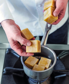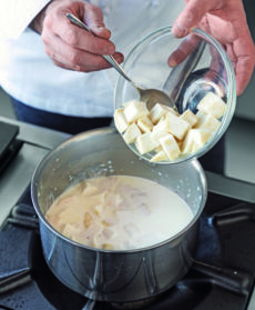 Tagliate a cubetti il sedano rapa pulito tenendone da parte 2 fette sottili tagliate con la mandolina.