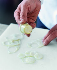 Trasferite la crema in una sacca da pasticciere. Ricavate alcuni cerchietti dalle fette di sedano rapa tenute da parte con uno stampino, metteteli in acqua bollente acidulata con 1 cucchiaio di aceto di mele, spegnete e lasciate in ammollo.