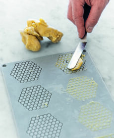Preparate le 2 frolle impastando gli ingredienti (tranne il polline che aggiungerete a cottura ultimata) e copritele con un telo pulito. Spalmate la frolla neutra con una spatola su uno stampo con i favi. Grattugiate l'altra frolla con una grattugia a fori grandi e trasferitela sulla placca rivestita di carta da forno. Cuocete a 160° per alcuni minuti e ripetete l'operazione con la frolla nello stampo. Mettete lo stampo con i favi nel congelatore fino al momento di sformare.