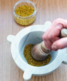 Pestate il polline nel mortaio, unite poi la frolla grattugiata e sbriciolatela con il pestello per ottenere una polvere profumata. Salate i filetti di salmerino abbondantemente e lasciateli insaporire per 10 minuti. Sciacquateli e tagliate i bordi per ottenere una forma regolare. Scaldateli brevemente a 50° a bagnomaria.