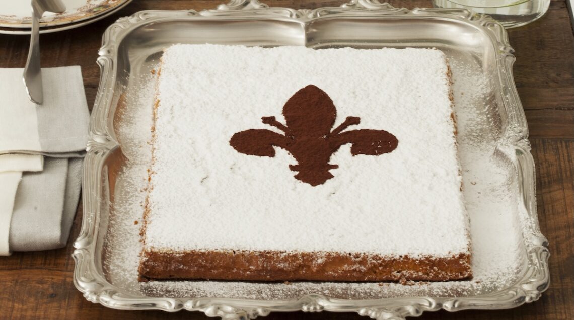 La prima specialità è la schiacciata alla fiorentina. Qui il nome trae in inganno, facendo pensare alla schiacciata salata, focaccia tipica toscana con cui condivide la lievitazione e la cottura in teglia ma non certo il gusto. Dalla forma comunque rettangolare e l’altezza che non dovrebbe superare i 3 centimetri, questo soffice dolce lievitato viene oggi preparato con uova, zucchero, farina, strutto o burro, scorza d’arancia e spezie. Spolverizzata con zucchero a velo, riporta tradizionalmente al centro un inconfondibile giglio fiorentino di cacao.