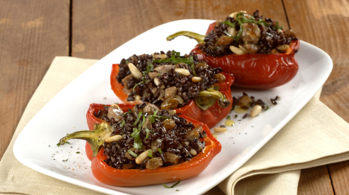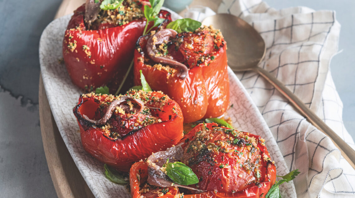 Ricca ricetta mediterranea, questi peperoni ripieni, tipici della tradizione pugliese, regalano un intenso gioco di contrasti e assonanze