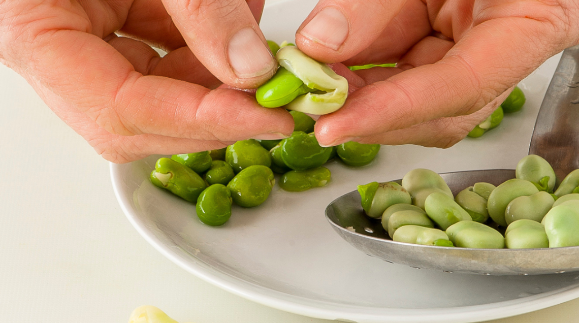Di solito si scottano in acqua bollente, oppure potete saltarle con sale grosso in una padella a fondo pesante mescolandole. Schiacciate le fave a una a una tra le dita: sgusceranno fuori dalla pellicina in un lampo.