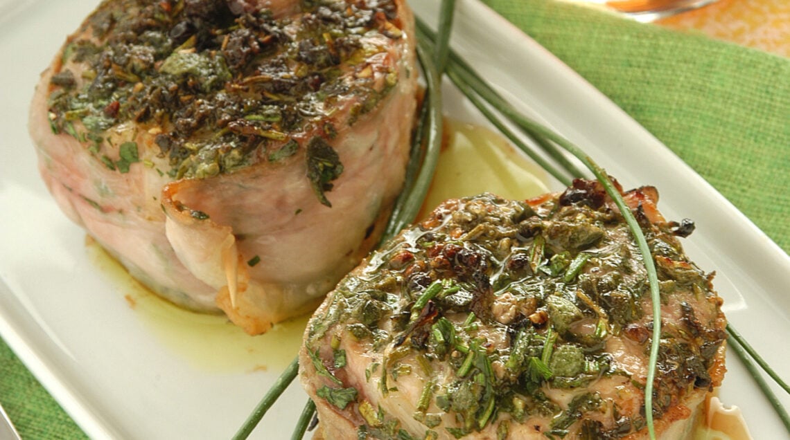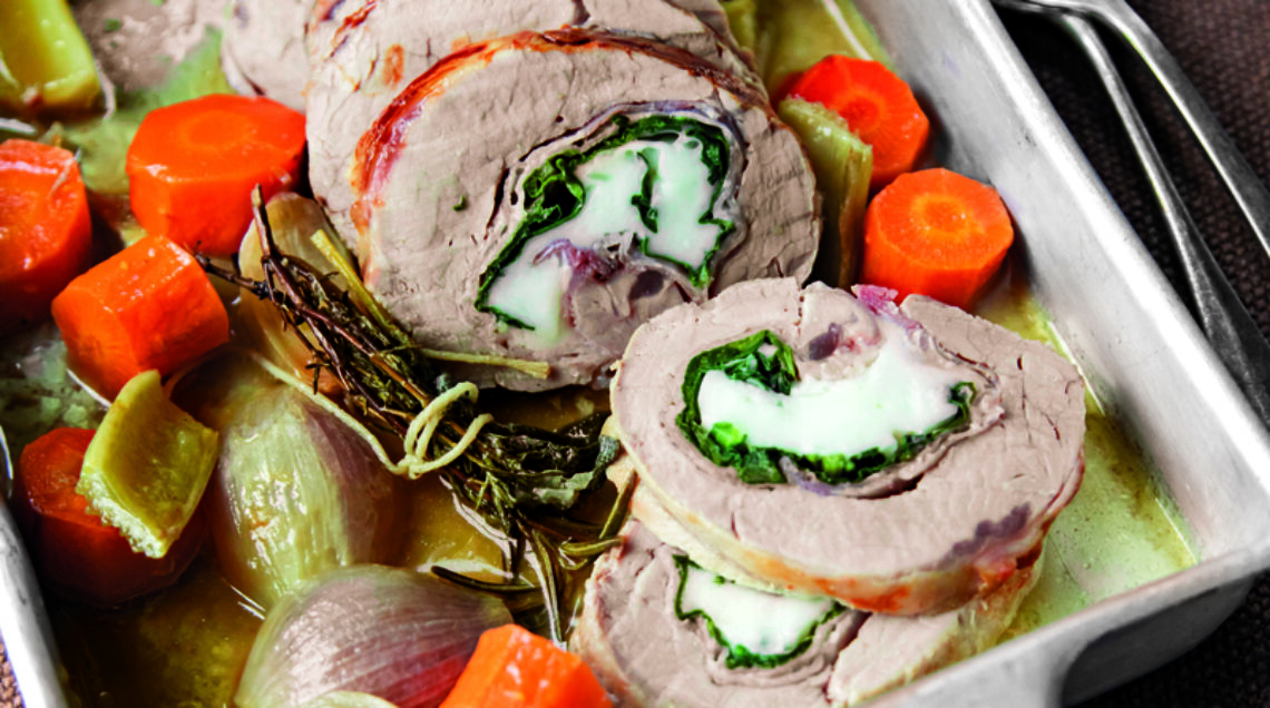 Un filetto di maiale farcito con bietole, parmigiano e prosciutto crudo cotto al forno con sfiziose verdure, vino rosso e brodo.