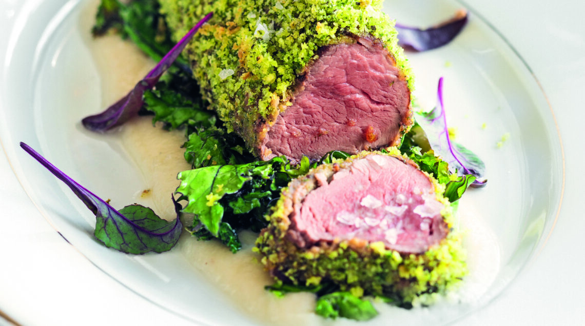 Filetto di maiale iberico in crosta di erbe aromatiche su crema di topinambur