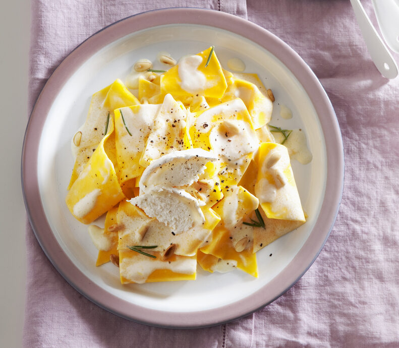 SUGGERIMENTI: Per questa ricetta scegliete il formaggio di capra fresco che ha un gusto delicato ma caratteristico, che ben si sposa con panna e pinoli tostati.