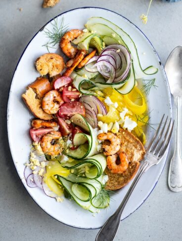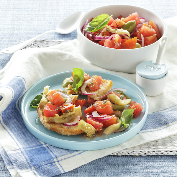 Lavate 600 g di pomodori costoluti, tagliateli prima a fette spesse un dito e poi a cubetti regolari. Sgocciolate 150 g di melanzane sott’olio e tagliatele a striscioline. Affettate finissima una cipolla rossa sbucciata. Mescolate la cipolla e i pomodori in un’insalatiera, unite 16 olive verdi condite, un po’ schiacciate, 6 friselle spezzettate e una presa di origano. Mescolate e lasciate riposare per circa 10 minuti. Distribuite l’insalata in 4 piatti, aggiungete le melanzane e mescolate. Guarnite con basilico e un altro filo d’olio. Per 4 persone.