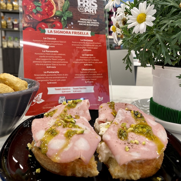 L’idea di Frisart è quella di affiancare al “modello base” una serie di proposte creative pescando a piene mani fra le eccellenze italiane e mettendo a punto altre 5 variazioni sul tema: con mortadella Igp, stracciatella, pesto e granella di pistacchi siciliani (foto a sinistra), con puntarelle, stracciatella, alici calabresi e olio pugliese al bergamotto, caprese con pomodoro e mozzarella fiordilatte, “modaiola” con salmone affumicato, guacamole, avocado, sesamo, lime e olio aromatizzato alla cipolla.