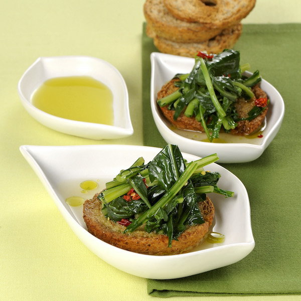 Mondate e lavate 500 g di catalogna, tagliatela a pezzetti e lessatela in un 1,5 litri di brodo vegetale a cui avrete aggiunto 2 spicchi di aglio e un peperoncino piccante. Sfregate 6 friselle con uno spicchio d’aglio tagliato a metà. Disponetele nei piatti individuali e ricopritele con la catalogna, ben sgocciolata. Se vi piace, aggiungete un pizzico di peperoncino in più. Versate sopra ogni frisella un mestolino di brodo, condite con un giro d'olio olio e servite. Per 6 persone.