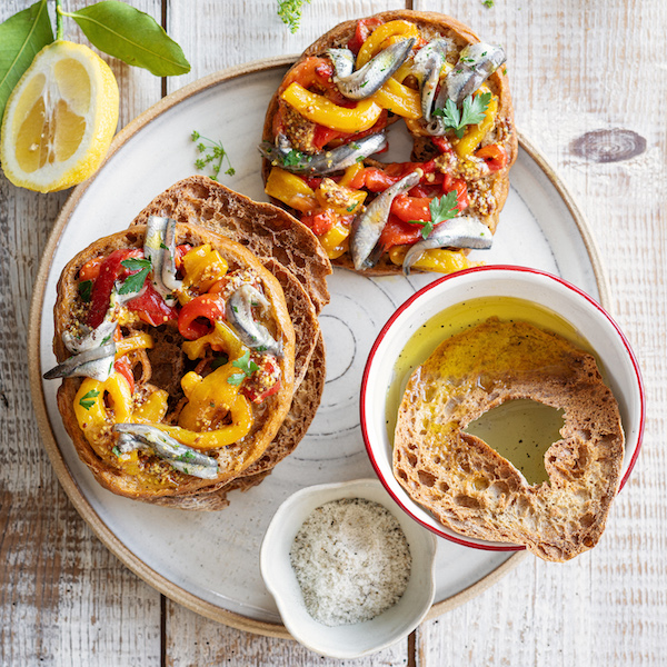 Lavate 2 peperoni (rosso e giallo) e arrostiteli sotto il grill del forno, girandoli 2-3 volte. Lasciateli intiepidire, spellateli, puliteli, tagliateli a striscioline e raccoglieteli in una ciotola. Conditeli con mezzo cucchiaio di senape all’antica, un filo di olio, sale e peperoncino. Preparate un’emulsione con la scorza grattugiata e il succo di un limone, olio, prezzemolo e aglio sbucciato tritati e un pizzico di sale. Disponetevi 12 alici marinate e lasciate insaporire per 20 minuti. In una ciotola, emulsionate una tazza d’acqua e 2 cucchiai d’olio con un pizzico di sale. Immergetevi per qualche istante 4 friselle e sistematele man mano su un piatto da portata. Guarnitele con i peperoni, le alici scolate, un filo d’olio e qualche fogliolina di prezzemolo. Per 4 persone.