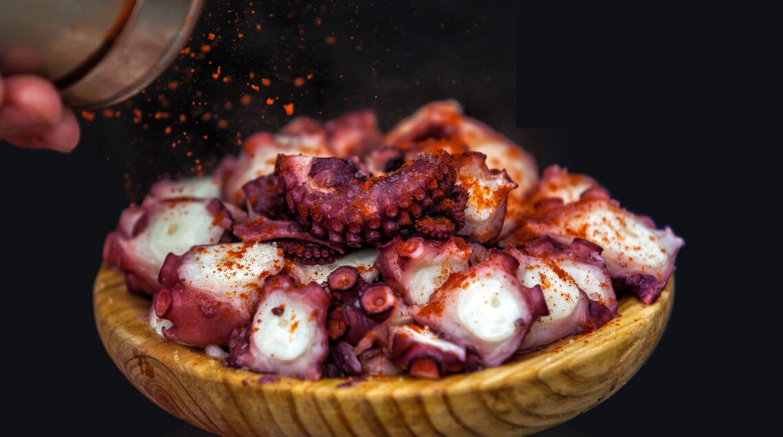 Pulpo á feira (polpo alla galiziana) Una specialità ormai nota in tutto il mondo, il pulpo á feira o polpo alla galiziana (chiamato pulpo á la gallega in tutto il resto della Spagna). Il nome galiziano del piatto – polpo della fiera – ne racconta la tradizione: nel XVI secolo, nelle vicinanze del Monastero di Oseira, si svolgeva un’importante Fiera del Bestiame. Come era usanza all’epoca, i polpi venivano essiccati per conservarli, così i monaci, per sfamare i visitatori della fiera, cucinavano i polpi a pezzi e li condivano con sale e olio d’oliva. Da lì derivò il soprannome “á feira”. È un piatto apparentemente semplice, la difficoltà sta nel cuocere il polpo alla perfezione. ll polpo cotto viene servito condito con sale grosso, paprika dolce affumicata (pimentón de la Vera) e un filo di olio d’oliva. Tipicamente, in Galizia lo si serve su un piatto di legno di pino – poiché il legno assorbe l’acqua ma non l’olio, il che lo rende ideale per questa ricetta: