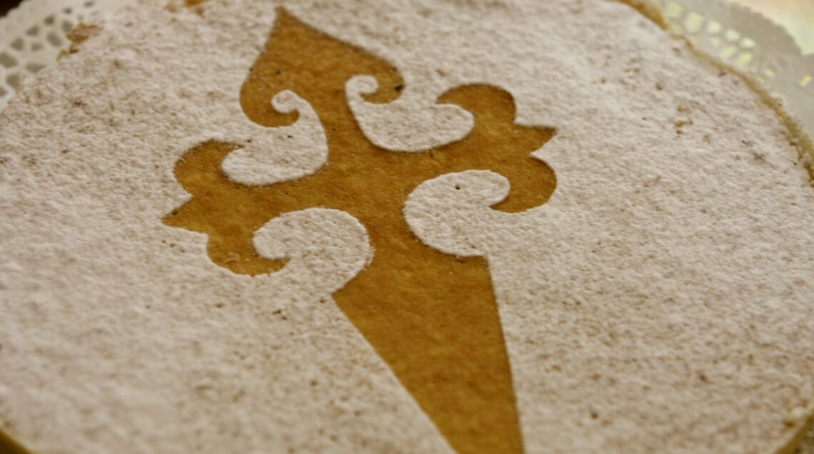 5 Disegnate e ritagliate una croce di Santiago da un cartoncino, posizionatelo al centro della torta e si spolverizzatela con lo zucchero a velo. Una volta tolto il cartoncino, sulla torta resterà il disegno.