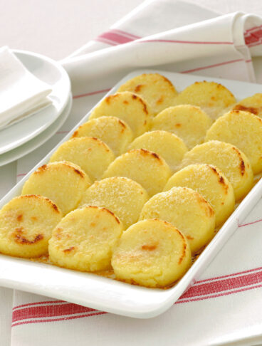 In alternativa, per ricavare i dischetti senza scarti, arrotolate il foglio di carta da forno su cui avrete steso il composto, formando un salsicciotto (con attenzione perché il composto sarà bollente). Fatelo raffreddare e poi tagliatelo a fette con un coltello dalla lama inumidita. Disponete i dischetti leggermente sovrapposti sul fondo della pirofila imburrata, irrorate con burro fuso, spolverizzate di parmigiano e passate in forno a gratinare.
