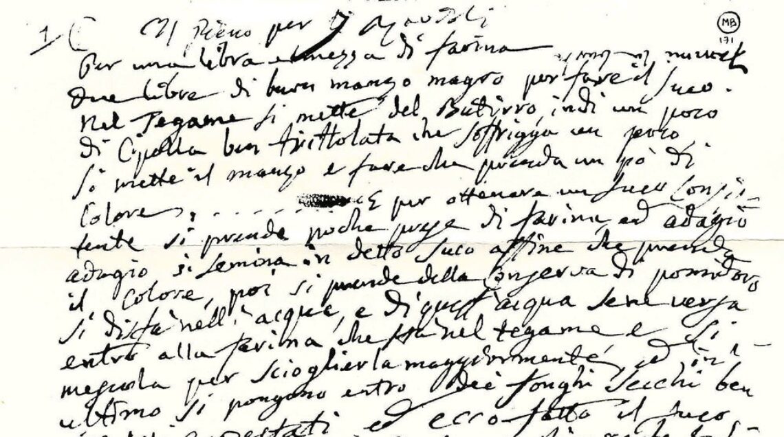 Il manoscritto con la ricetta risale al 1839, un anno prima della sua morte. Il testo contiene, in dettaglio, la ricetta d’uno dei suoi piatti preferiti: i ravioli conditi con il “tocco” (sugo) alla genovese. È un piatto robusto, dal grande successo popolare. Paganini era nato a Genova in un quartiere popolare, figlio di un lavoratore portuale grande appassionato di musica, che aveva intuito il genio del figlio fin dall’infanzia.